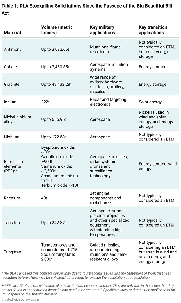 Nonostante queste limitazioni, l’analisi delle recenti attività della Defense Logistics Agency dimostra l’emergere di priorità nello stoccaggio di minerali dual use, evidenziando il ruolo dell’esercito statunitense nelle catene di approvvigionamento vitali per le tecnologie militari e di transizione energetica. La DLA immagazzina circa 48 minerali e leghe in sei depositi negli Stati Uniti. Il Big Beautiful Bill di Trump ha stanziato 7,5 miliardi di dollari per minerali essenziali, di cui due milioni di dollari specificamente per la National Defense Stockpile. La tabella 1 (pag. 69) descrive i contratti e le richieste di stoccaggio DLA a partire dall’approvazione del disegno di legge.